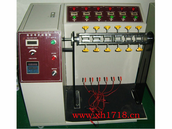 本试验机符合UL817等有关标准“软线组件和电源软线通用安全要求”的规定。适用于有关生产厂家和质检部门对电源线、DC线进行弯曲试验。本机可以测试插头引线及电线耐折强度,是将试品固定于夹具后施重,经弯曲到预定次数后,检测其断线率,或无法通电时机台自动停机,检视其总计弯曲次数。